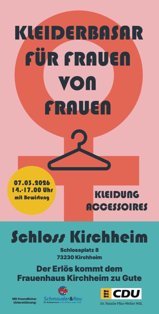 Bereits am Vortag, Samstag den 7. März, findet von 14-17 Uhr wieder ein Kleiderbasar im Schloss Kirchheim statt, dessen Erlös dem Frauenhaus Kirchheim zugutekommen wird.